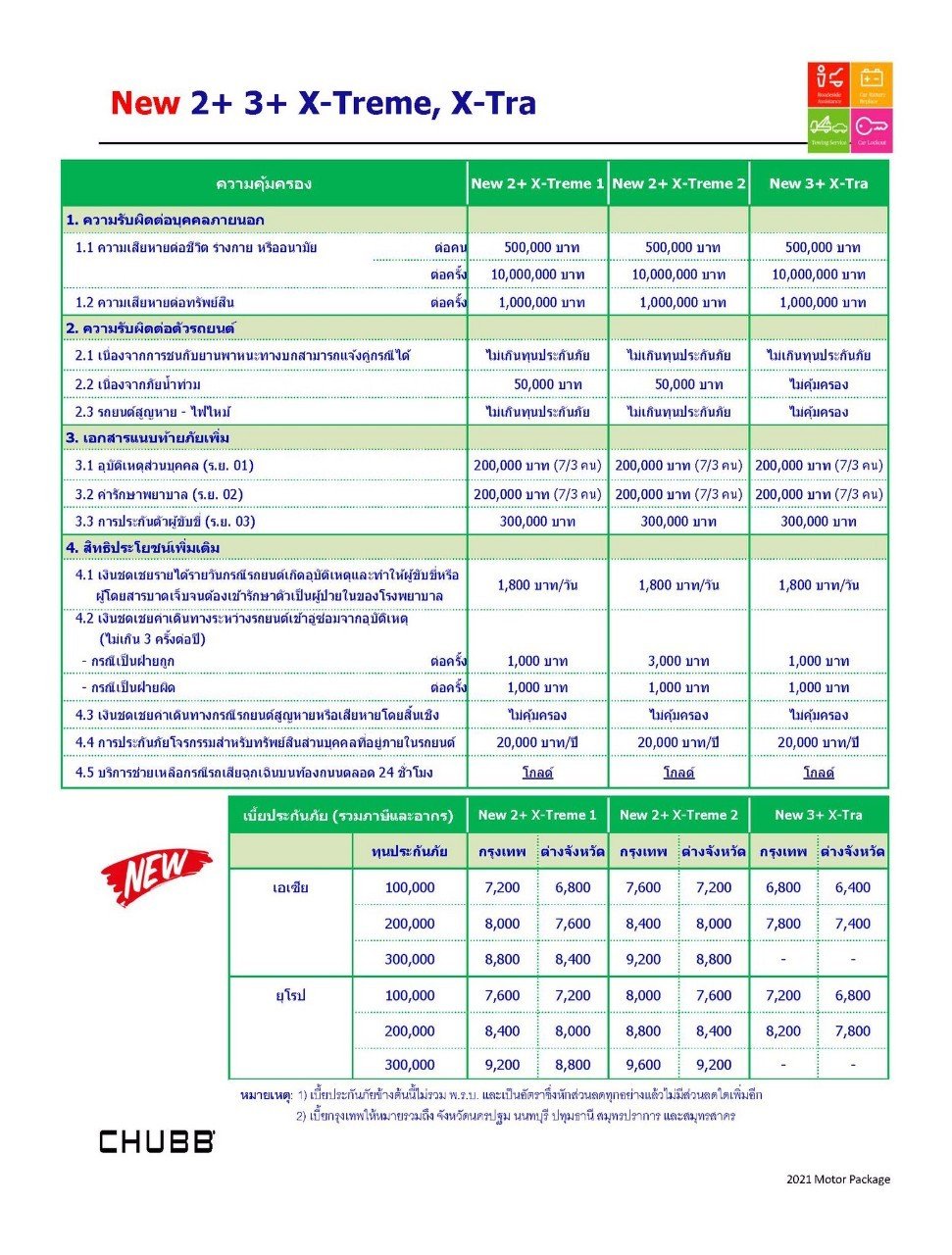 - การเดินทางต่อเนื่อง*: สำหรับรถยนต์ที่ทำการยก-ลากไปยังศูนย์บริการที่ได้รับอนุญาตและไม่สามารถซ่อมให้แล้วเสร็จภายใน 24 ชั่วโมงหลังจากที่รถยนต์ไปถึงศูนย์บริการให้บริการรถเช่าหรือค่าใช้จ่ายในการเดินทางระหว่างรถซ่อมตามจริง เป็นจำนวนเงินไม่เกิน 1,000 บาท ต่อวัน สูงสุดไม่เกิน 3 วันต่อเหตุการณ์ ในระหว่างที่รถยนต์ทำการซ่อมอยู่ในศูนย์บริการที่ได้รับอนุญาตเท่านั้น