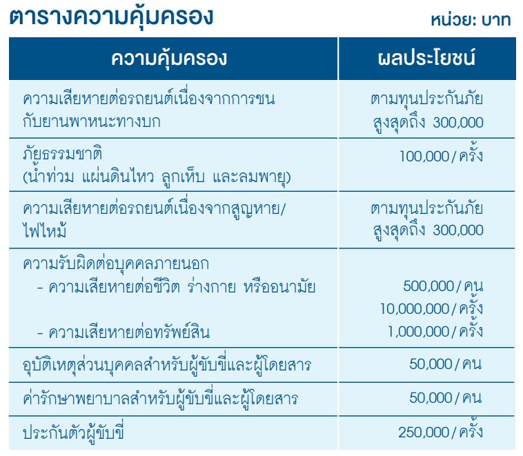 และคุ้มครองภัยธรรมชาติ ได้แก่ น้ำท่วม แผ่นดินไหว ลูกเห็บ และลมพายุ ให้ความอุ่นใจทุกเส้นทาง คุ้มครองครอบคลุม ทั้งตัวรถ ผู้ขับขี่ ผู้โดยสาร และบุคคลภายนอก