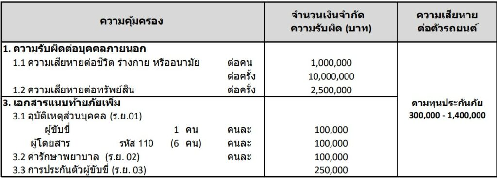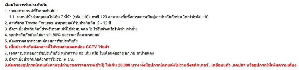 – คุ้มครองอุปกรณ์ตกแต่งเพิ่มเติมได้ตามรายการที่ระบุไว้ในกรมธรรม์ แต่ไม่เกิน 20,000 บาท ทั้งนี้ อุปกรณ์ตกแต่งไม่รวมถึงสติกเกอร์  เคลือบแก้ว ,แคปล่า หรืออุปกรณ์ที่เพิ่มความเสี่ยง