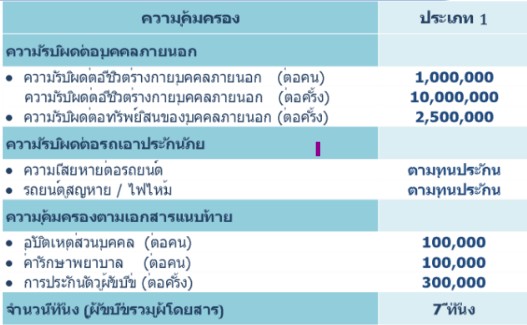 • อัตราเบี้ยประกันภัยสำหรับใช้งานส่วนบุคคล สงวนสิทธิ์ไม่รับรถยนต์รับจ้าง รถให้เช่า รถแต่ง รถดัดแปลง รถขนส่ง หรือรับรถขนส่งสินค้าที่มีความเสี่ยงภัยสูง เช่น เชื้อเพลิง กรด แก๊ส เป็นต้น
