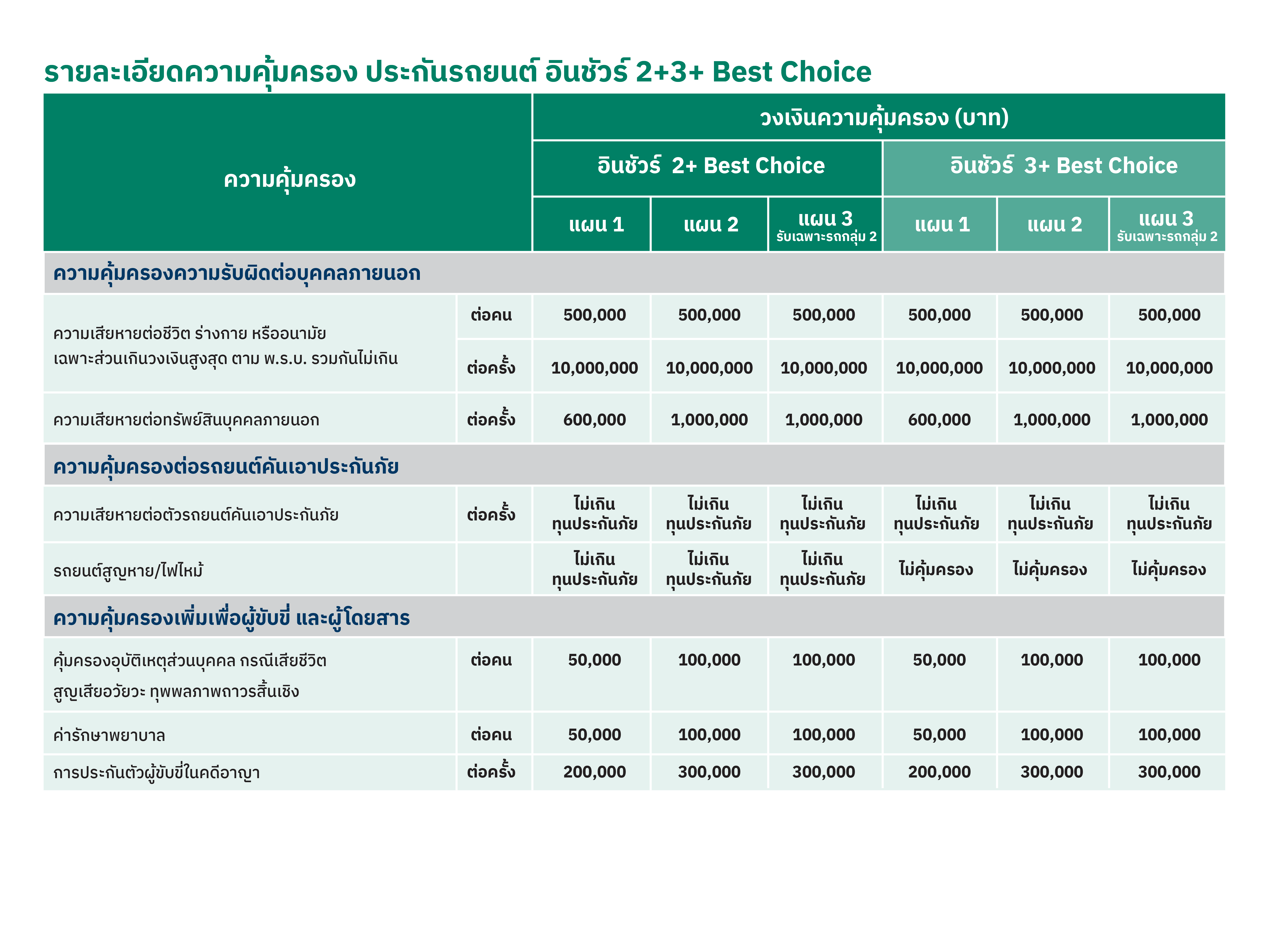 • ความคุ้มครองเพิ่มเพื่อผู้ขับขี่ และผู้โดยสาร รถเก๋ง (110) = 5 คน, รถกระบะ (320) = 3 คน, รถตู้ (210) = 7 คน)