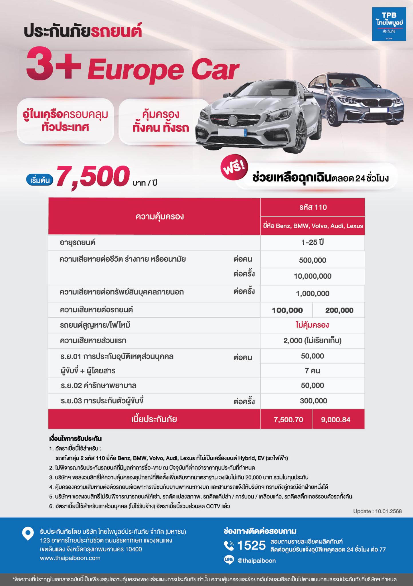 ประกันภัยรถยนต์ Europe Car 3+ พลัส ให้คุณขับขี่ได้อย่างอุ่นใจในทุกการเดินทาง ให้ความคุ้มครองสำหรับการชน ซึ่งก่อให้เกิดความเสียหายต่อทรัพย์สิน, ชีวิต, ร่างกาย ของคู่กรณี