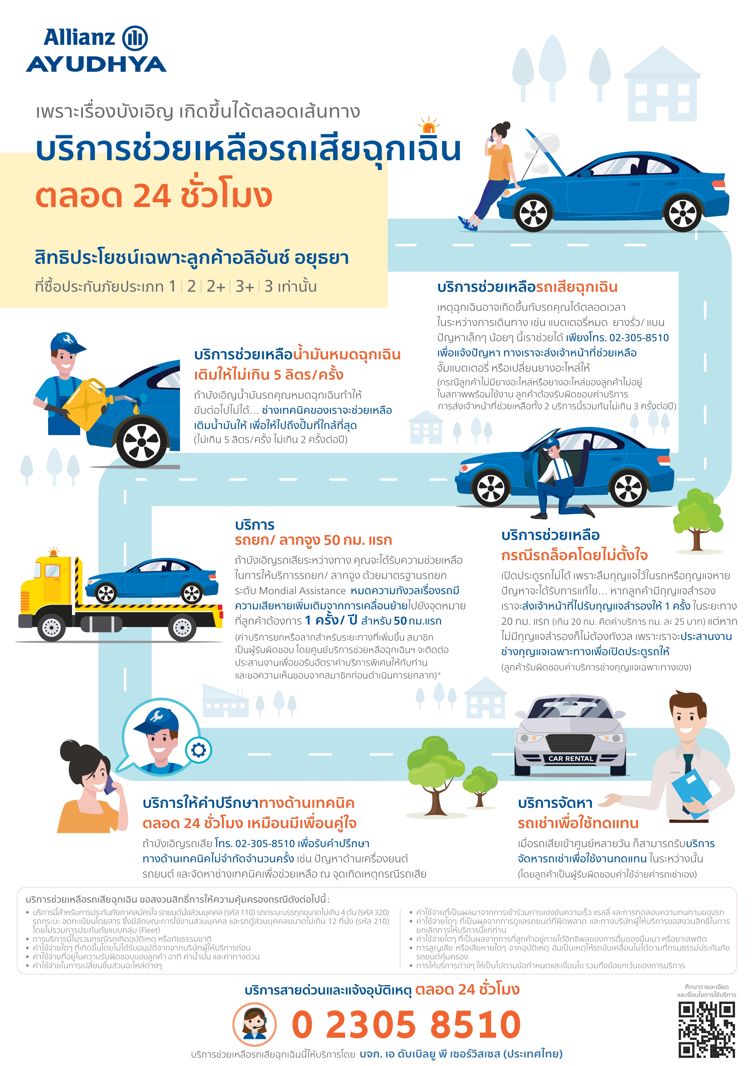 1. โทรศูนย์บริการช่วยเหลือฉุกเฉิน บริษัท อลิอันซ์ อยุธยา ประกันภัย จำกัด (มหาชน) โทร. 0-2305-8510