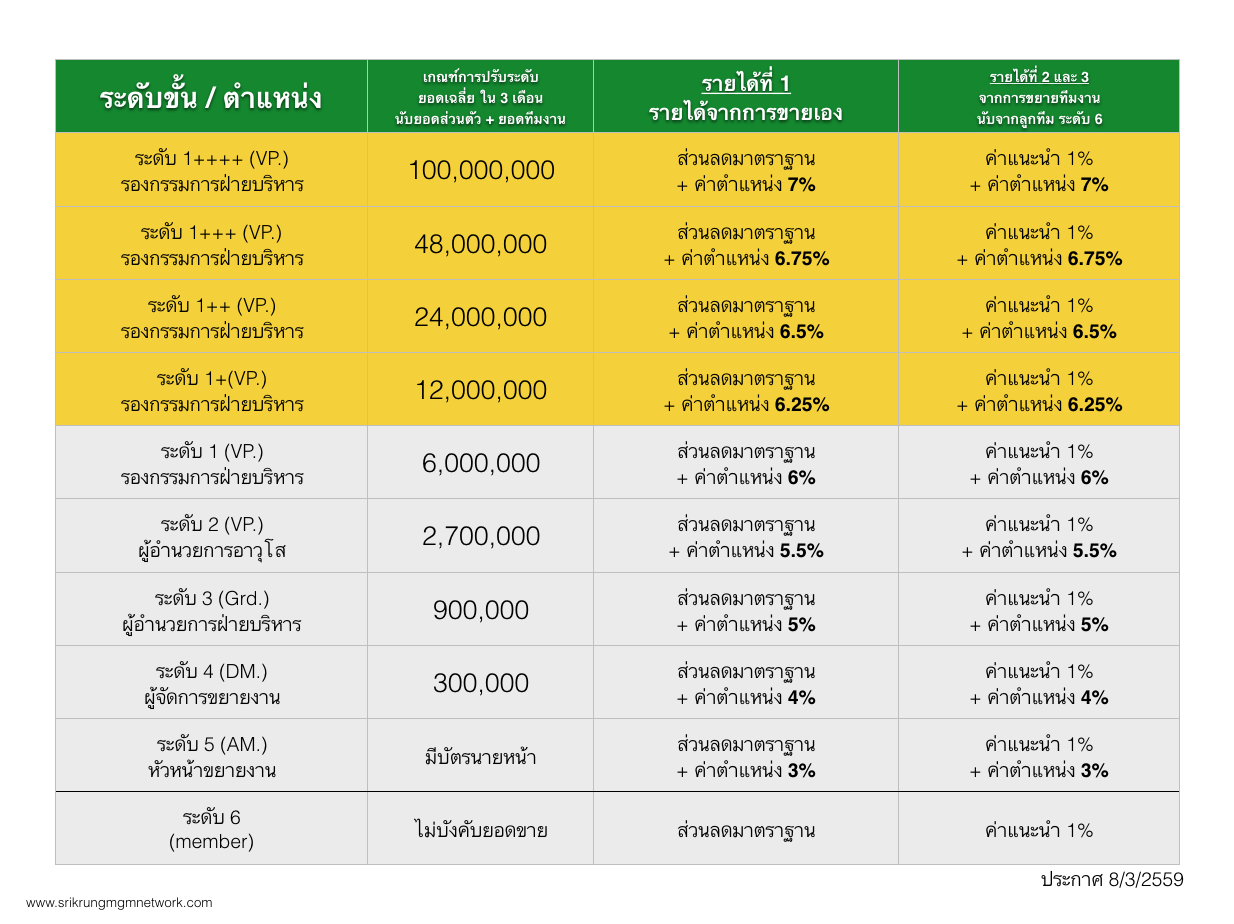 ถ้าคุณมีใบบอนุญาตนายหน้าประกันวินาศภัย สามารถขายประกันได้อย่างถูกต้องตามกฏหมาย รายได้จากบริษัทศรีกรุงโบรคเกอร์ ให้ผลตอบแทนเป็นระดับขั้นตามตำแหน่ง ยิ่งทำมากได้มาก มียอดขายตามเป้า ตำแหน่งเติบโต ค่าคอมมิชชั่นก็เพิ่มขึ้น ถ้ามัดจำ พรบ. มาออกเอง ได้คอม.เพิ่ม 5% มัดจำประกันมาออกเองได้คอม.เพิ่ม 2.5%